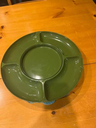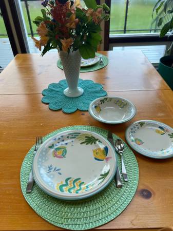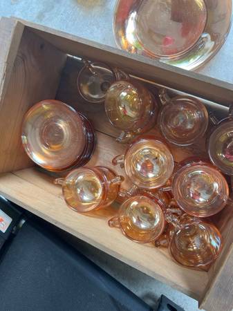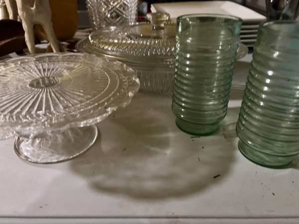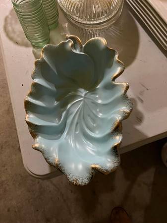 Milk glass fish $25 vas$25 Turquoise leaf GOLD TRIM $35 clear cake stand $20 casserole $25 green ribbed glasses 2 for $10 .