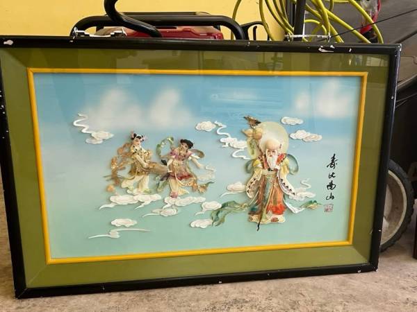 Asian shell art Abeloni coral and more ! Great for crafts $50 Vintage Hispanic Childs ponch $25 1950 w metal zipper .