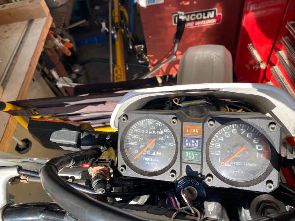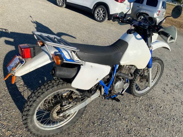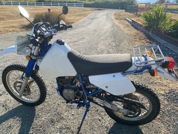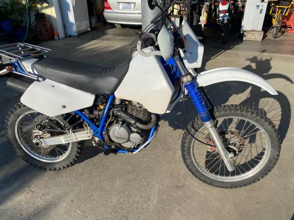 1990 Suzuki DR 350 6-spd, kick start. All new top end: piston, rings, .005 over, new OEM camshaft & chain, new Mikuni pumper carb, ign coil, plug, wire, battery, oil, filters. eBay gauges all work, original mileage unknown. Aftermarket tank, seat, bars, throttle, grips.