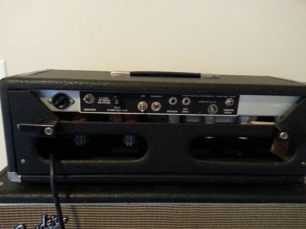 Transition era Bandmaster with original blackface AB763 circuit. Head only; the cab is sold. Chassis date stamp, #171168, indicates amp was built the 11th week of 1968 = March 11 - 15, 1968. (Silverface circuits were not introduced until Fall, 1968). New electrolytics and power resistors. Any leaking coupling caps and resistors that drifted more than 10% from original values are replaced. All tubes are good. In other words, this amp is reliably ready to gig.