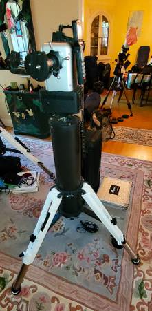 This is the latest AZ Pro from iOptron and is capable of carrying 33 pounds on the main axis and 10 pounds on the off axis. So a C9.25 SCT on one side and a 80-102mm refractor on the other or any lesser sizes. Comes with everything advertised, cases unused and new. NOTE: Telescopes not included. The mount works perfectly but doesn't see that much use. I have used it for imaging and at certain latitudes can get great images without field rotation becoming an issue. I had the 10 pound saddle machined to take two additional locking bolts so once both scopes are mounted and collimated there is no slippage common to the unmodified saddle that comes with the mount out of the box. So, a vast improvement in ensuring both scopes point to the same object. It is great for star parties for a wide field scope on one axis and a planetary on the other. Or, switch cameras between one or the other and be on target with both. I've used a 72mmED on one side and then a C9.25 on the other to good measure. One for DSOs and the other for planets, like two complete telescopes in one. Priced to sell at 50% off retail. No shipping, no tax. CASH and CARRY ONLY. No scammers peddling bogus checks, etc. You bring the cash and you get a fabulous mount. Read all the details in the High Point Scientific ad on this beauty. No dings or scratches and adjusted so the scopes and cameras clear the pier that holds 220 pounds! Easy to set up and simply press a button to self-calibrate and you're viewing or imaging!! Message or text me (no phone calls) for more information.