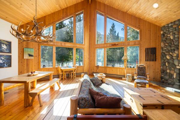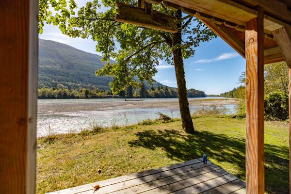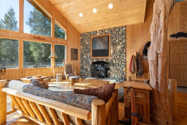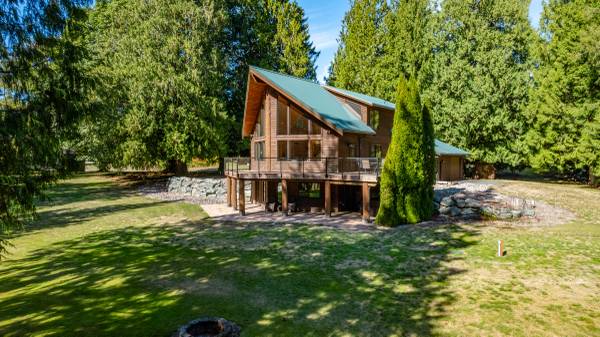 Rustic, Log-Accented Custom Residence on 3+ Riverfront Acres. Set in an upscale enclave with other high-end homes, this dramatic 4000+SF home rests on park-like grounds w mature trees, private setting, grassy terraced land w lots of room to play & relax. The vaulted great room, open kitchen w eating bar, huge view deck, upper level primary suite with views and a cozy finished basement are warm and inviting. Log posts, steps and railings, T&G ceiling, hardwood flooring, river rock fireplaces, fly-tying table, wine cellar, hot tub & more. Fish from your own property, check out the 'fishing cabin' on the lower level by the river. Make this amazing home your own and enjoy eagle-watching, sunsets and the ever-changing beautiful Skagit River.