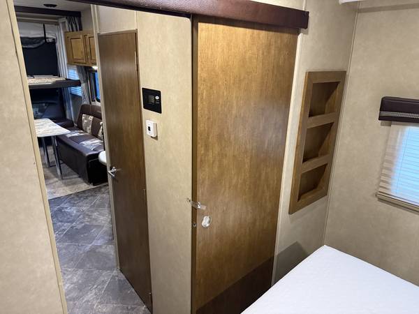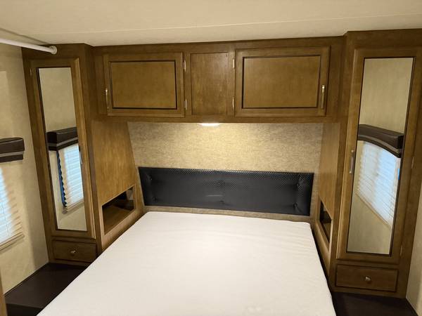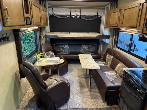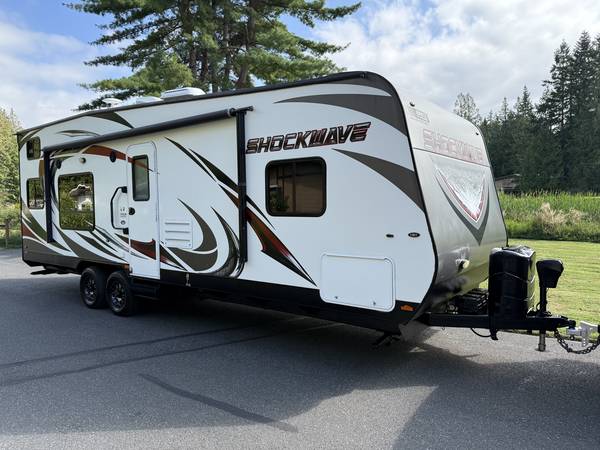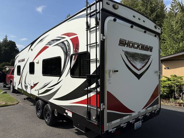 2017 Forest River Shockwave Toy hauler T25FQ. Dry weight 6,671 lbs. and 987 lbs. hitch weight. Sleeps 7, walk around Queen in the front bedroom, tons of storage cabinets, Happy Jack Queen bed and sofa/bed. 2 recliners and a side sofa, both with tables. Heated storage tanks, fully enclosed under belly. Large power awning with LED lights, all around window tint. Great tires and brakes, ducted A/C, Onan generator with 54 hours on meter. No current / past water leaks, no soft spots, extremely clean non-smokers. Towing adjustable receiver with load-leveling sway bars. Front power crank jack, TV, stereo system, on-board gas station and filler handle, electronic door lock, tongue lock, outside shower, roof solar panel, 2 deep cycle batteries, 2 covered propane tanks, roof access ladder, 2nd owner, I’ve had it for 5 years. I retired and bought a bigger 5th wheel. I have the clean title in hand. I will be keeping the license plate in accordance with WA law. $26,000 360-815-7684, text is best or leave a phone message, thanks. I’m near Lake Padden, Bellingham.