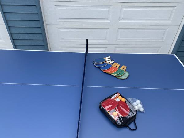 Comes with net, and a bunch of paddles and balls. You're ready to play!