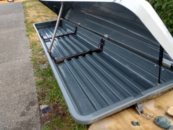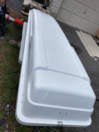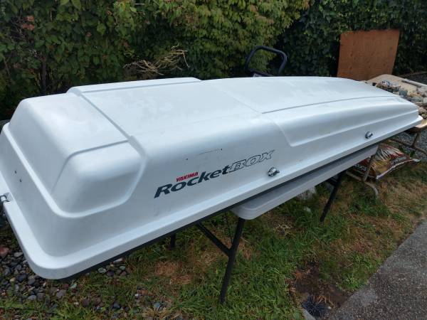 * Yakima Large Rooftop Cargo Box, the Rocketbox XL model, 18cuft . Fits ALL bar types. The absolute best way to hold skis, snowboards, dufflebags, backpacks, suitcases, etc. 549 firm. Color: white.