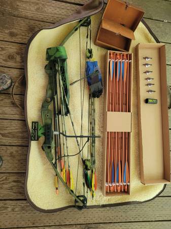 Got this bow a few year ago to try doing something outdoorsy with the family, they out grew the activity after a few months. Compound bow, 6 broadleads, and like 21 arrows. Ad will be deleted when sold, messages asking if it is still available will be ignored and deleted. Read the ad and do your own research.