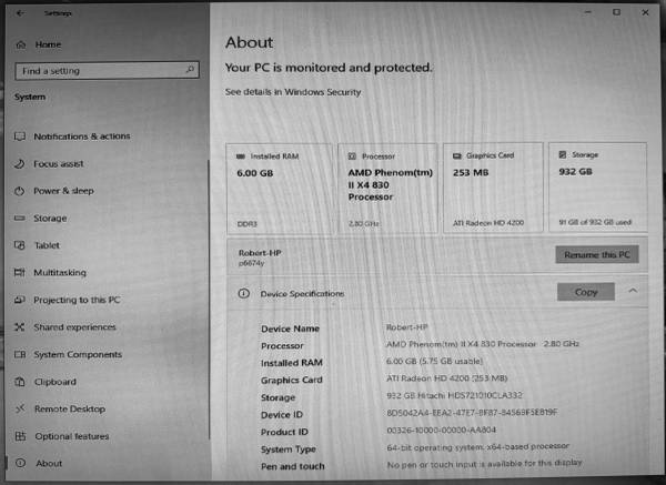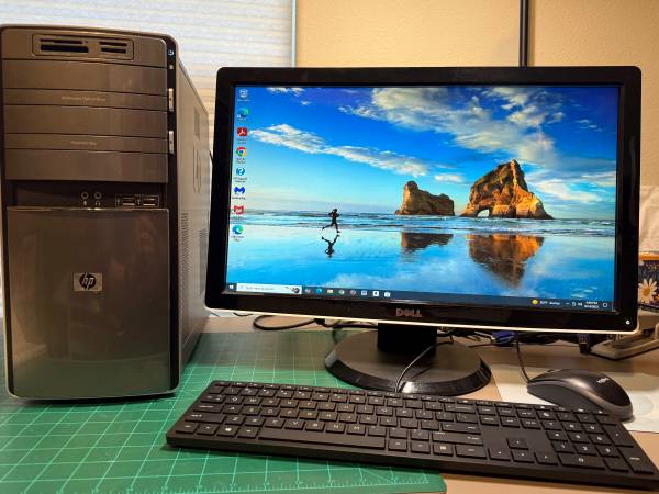 hp Full size desktop computer running windows 10 home. Includes full size keyboard with number pad, hp mouse and Dell Monitor. Processor is AMD Phenon II x4830 running at 2.8GHz. Has a 1TB SSD and 6GB Ram. Software includes the new CoPilot AI, Microsoft Office 2010 (lives on the computer, not necessary to pay for on line access). A nice computer for home use, browsing the internet or for students. Asking only $50 for the complete package.