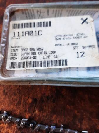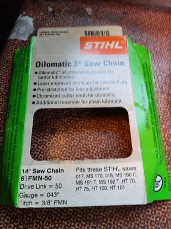 like the posting title says, 14" Stihl Saw Chain 61PMN-50 brand new in the box, never used, (Stihl part # 3982 005 0050) round file size is 5/32, 50 drive links, Gauge is .043, Pitch is 3/8 PMN will fit the following Saws 017, MS 170, 018, MS 180 C, MS 191 T, MS 192 T, HT 70, 75, 100, and 101, I'm asking 20 dollars for the Saw Chain, if interested respond to ad, call, text show contact info