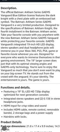 Gaems ,vanguard personal gaming and entertainment sistem, exclusive batman arkham knight límited edition .no remote control.no 2 storage bags.no headphone.