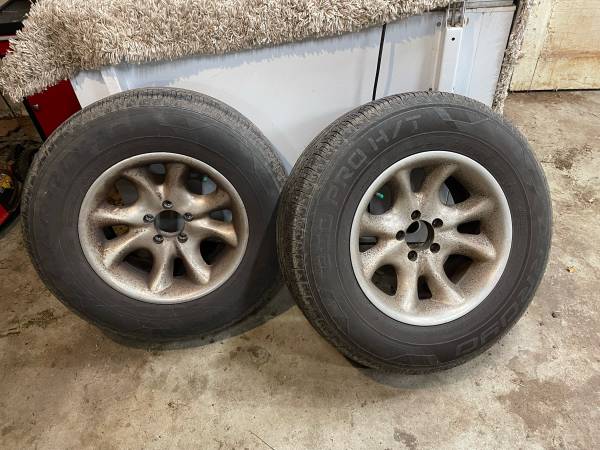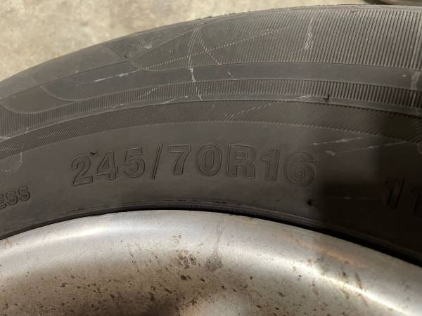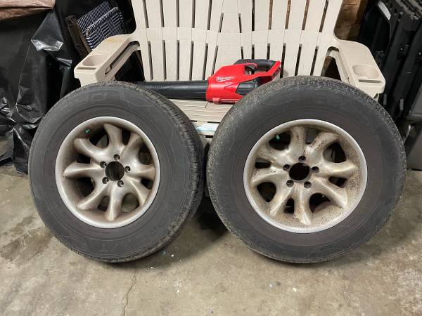 4 ugly 16 inch wheels (5x4.5 ford pattern) with 245/70-16 tires (maybe 10k on them). Had them on a 2002 Ranger. Includes all 4 center caps $125