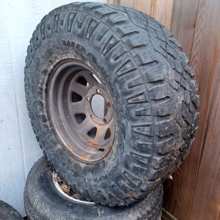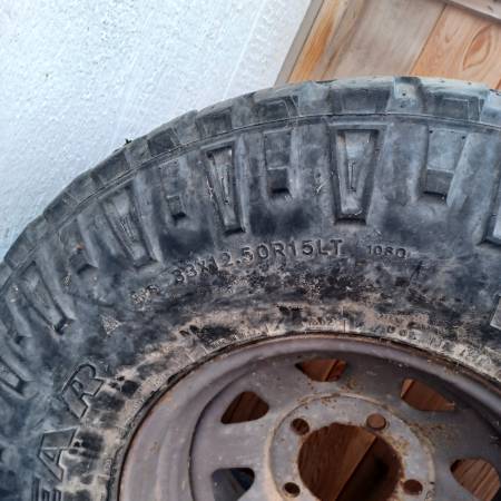 One Used 33/12/15 wrangler tire and rim 5 on 5 1/2 lug pattern steel rim 10-20% tread Good for a spare